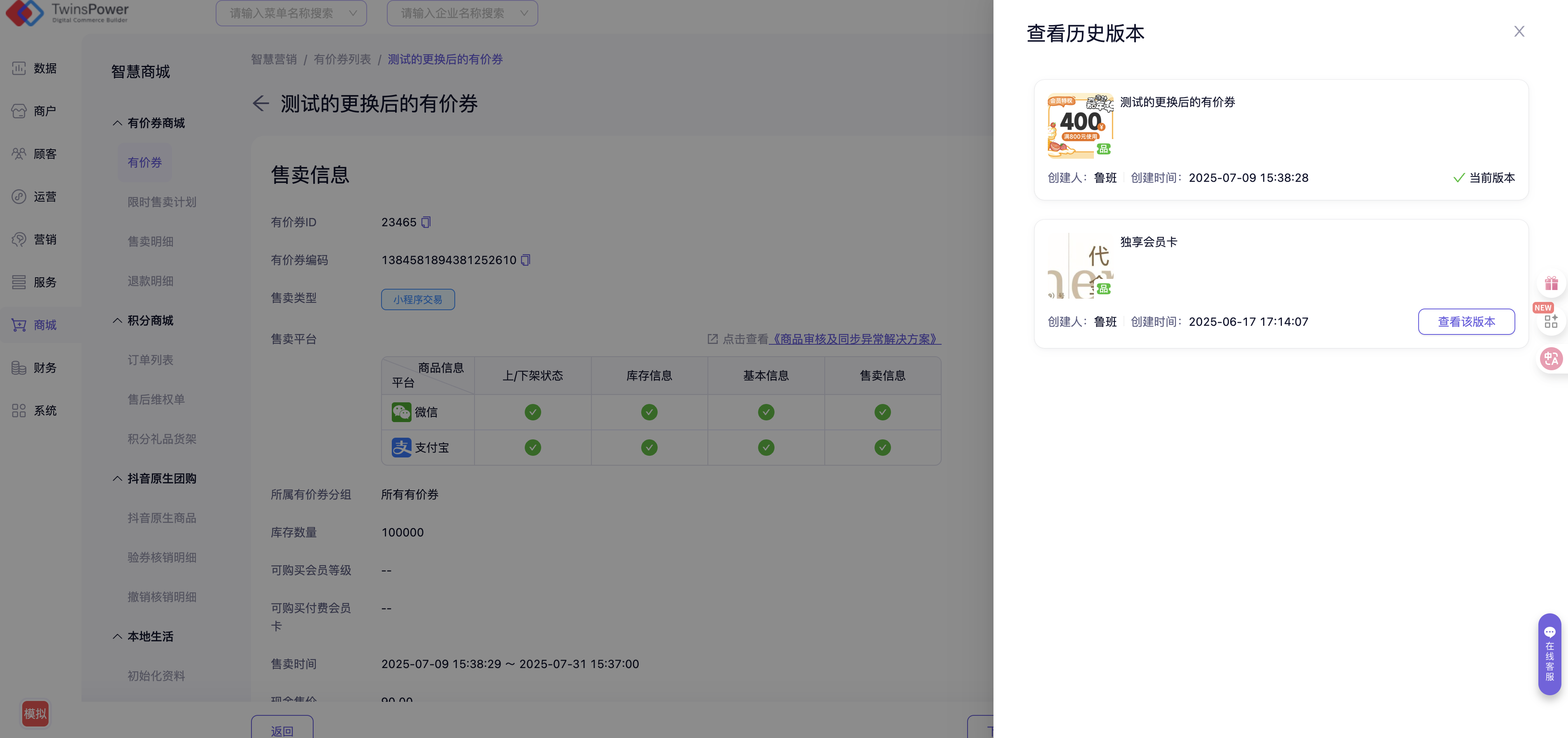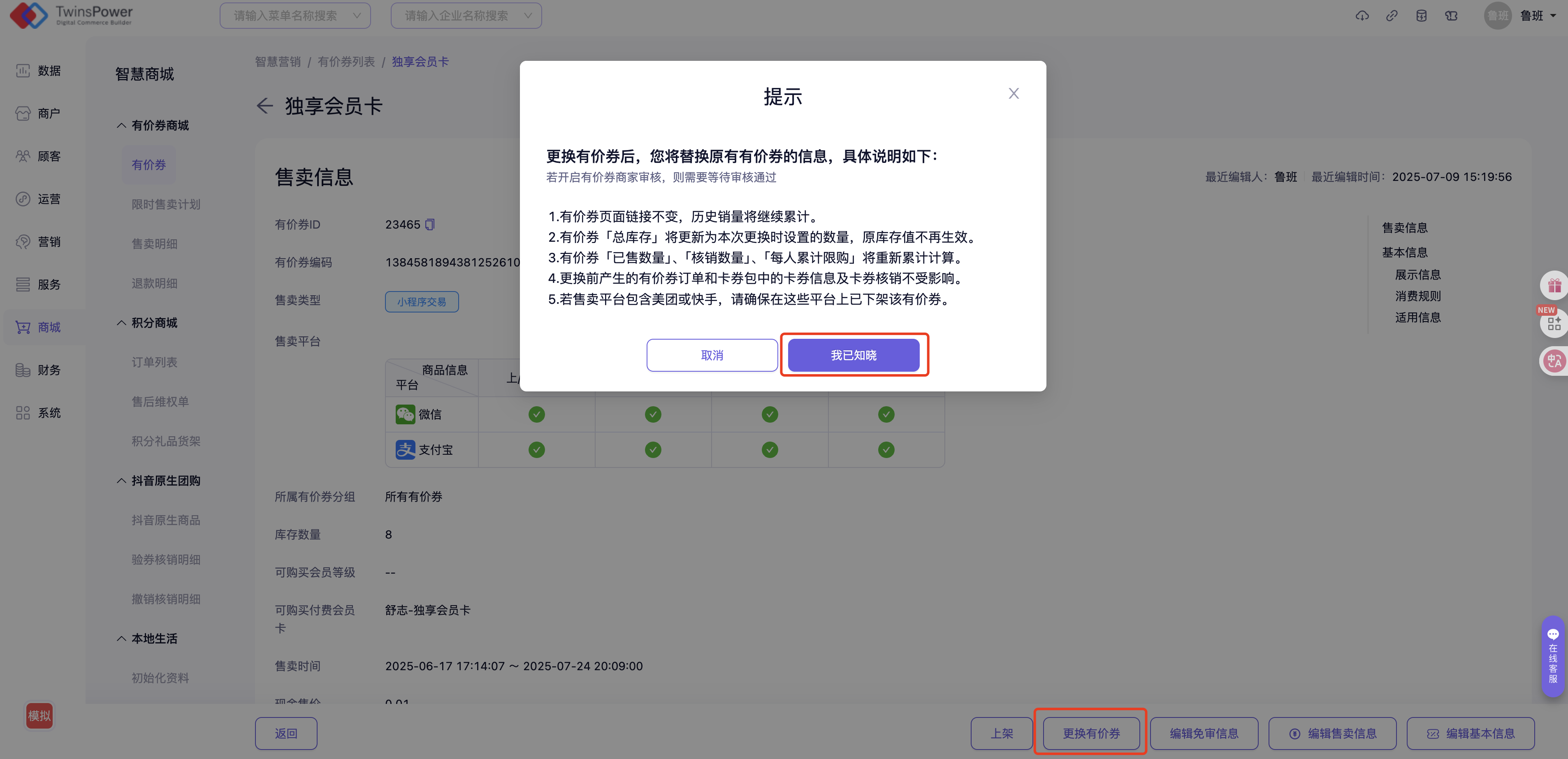 有价券的销量对于平台侧的曝光和转化是非常重要的指标之一,更换有价券功能可将卡券基本信息修改,而券的累计销量不变(即商管后台变更券信息,而平台侧的商品id不变),从而实现券的累计销量不断叠加。