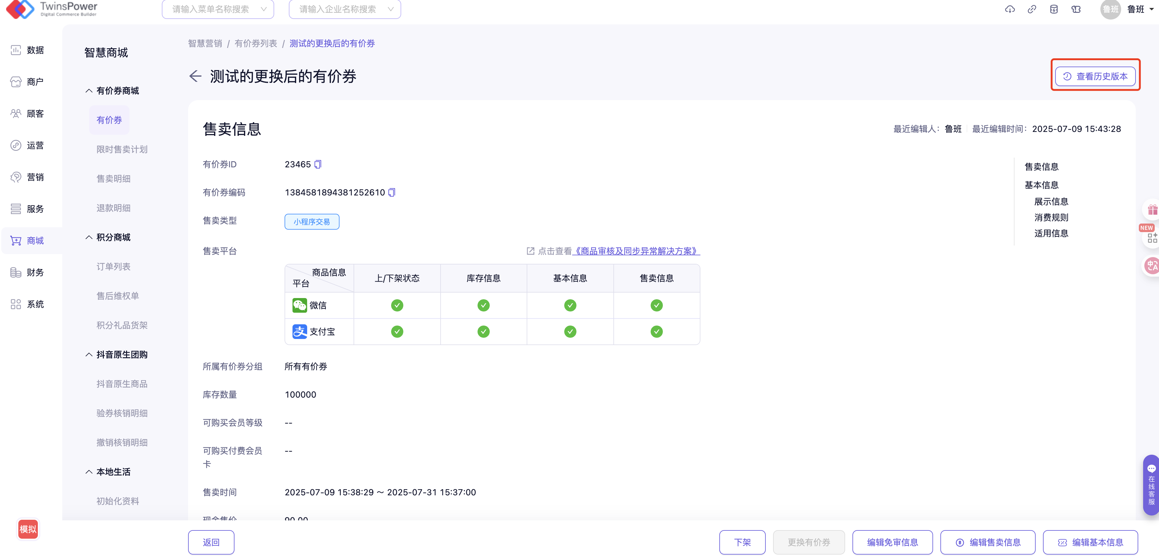 - 同时可点击「查看旧版本」来查看该有价券编辑修改前的所有信息,以及本次所编辑的内容。其中红色标记字段表示本次变更的内容