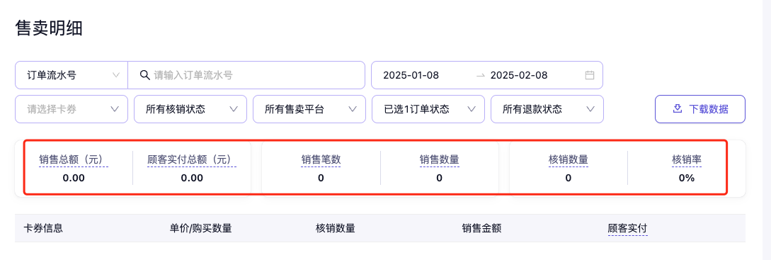 数据概览中默认展示近一个月内的销售总额,顾客实付总额,销售笔数,销售数量,核销数量,核销率。如需查看更多时间范围内的数据,可手动调整日期(所选时间段的长度不能超过3个月,超过3个月的可分批查询)