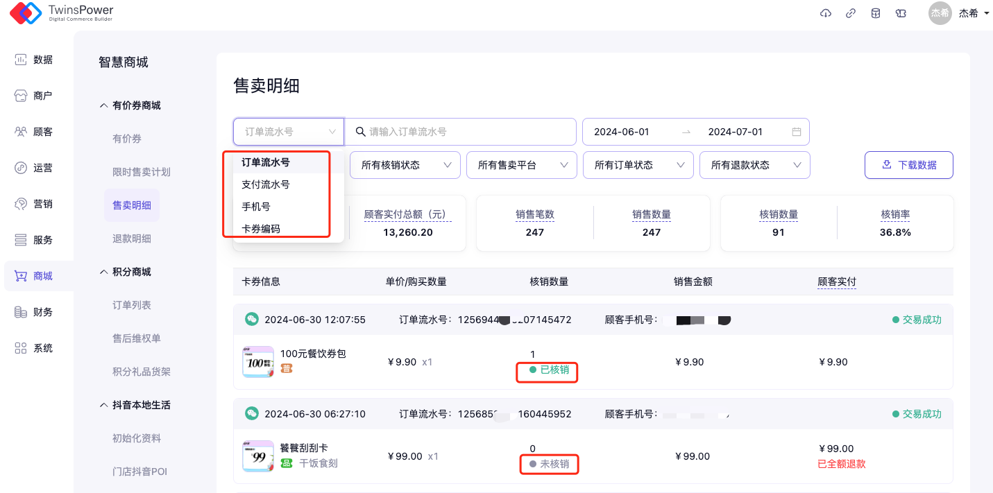 支持通过订单流水号/支付流水号/手机号/卡券编码搜索指定订单信息,需注意用不同的搜索数据时需选择对应的筛选字段。例使用手机号进行搜索时,需选择「手机号」这个筛选项