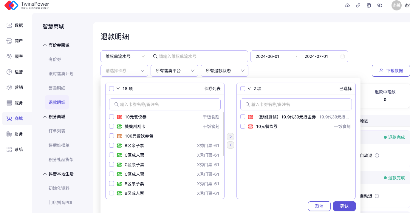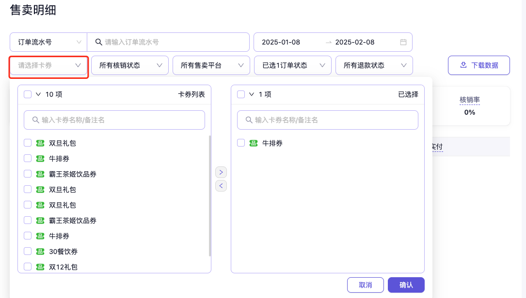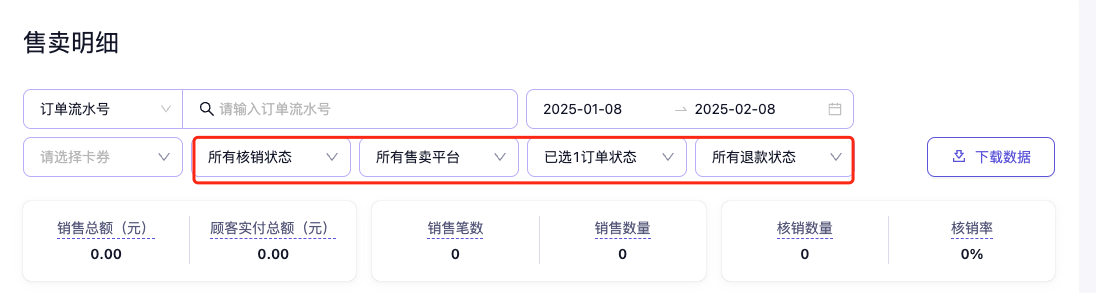 - 支持通过卡券核销状态,售卖平台,订单状态,退款状态进行数据筛选