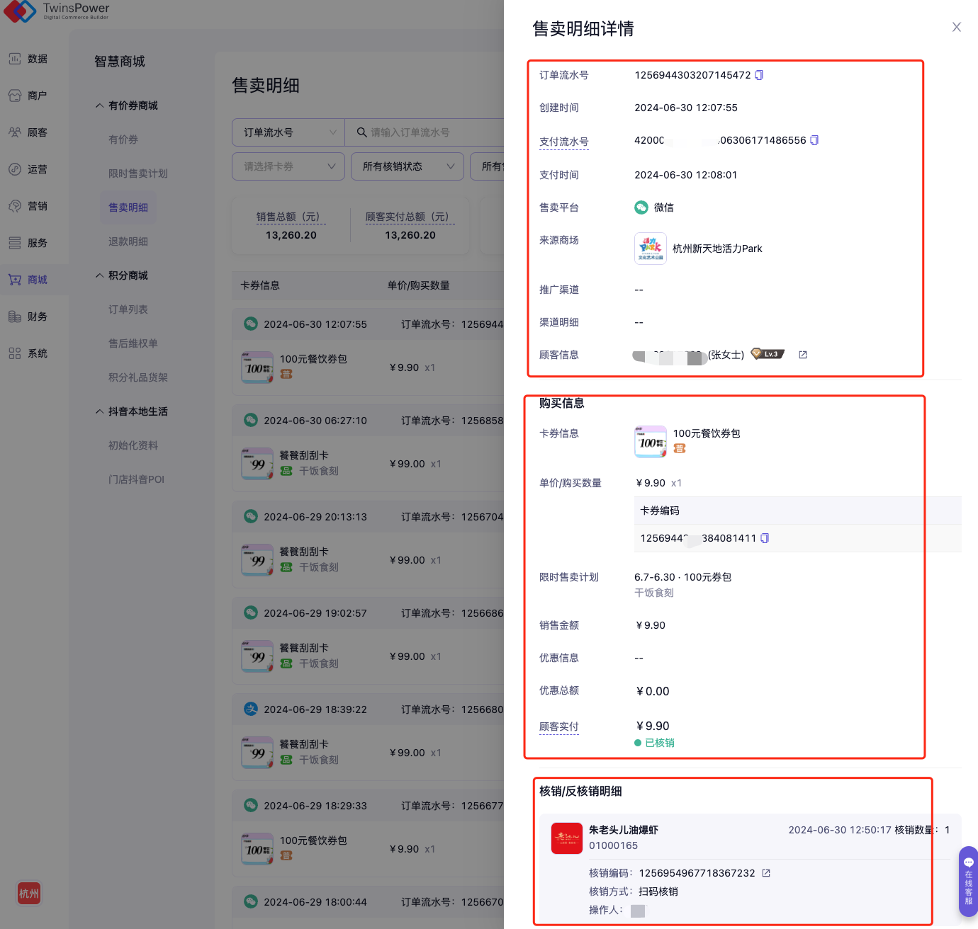 - 点击对应的售卖明细,可查看售卖明细详情,详情中包含支付流水号、订单相关信息、卡券编码、卡券核销状态等信息。如已核销/反核销可点击查看核销/反核销明细