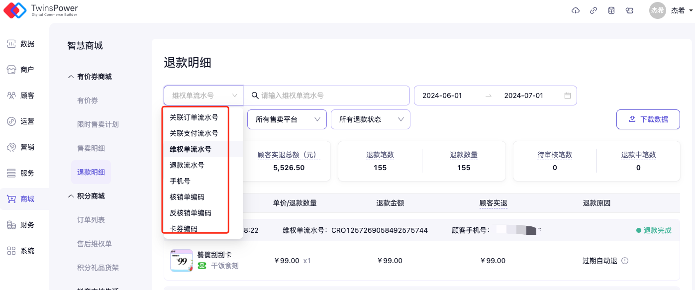 - 支持通过关联订单流水号/关联支付流水号/维权单流水号/退款流水号/手机号/核销单编码/反核销单编码/卡券编码等信息进行搜索指定退款明细。需注意不同的搜索数据需选择对应的筛选字段,即使用手机号进行搜索时,需选择「手机号」这个字段
