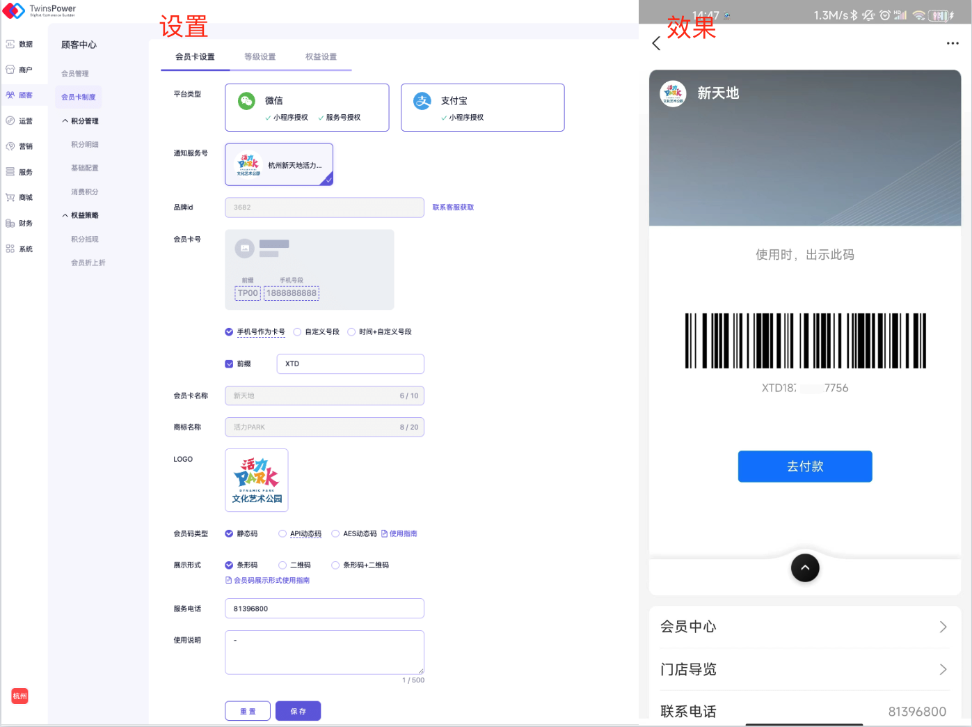 你可以设计电子版的会员卡版面,包括定义会员卡卡面号段,会员码类型,备注使用说明等。该版面会展示于小程序的会员个人中心。(会员卡设置需要至少完成支付宝或微信一方小程序授权后方能进行)