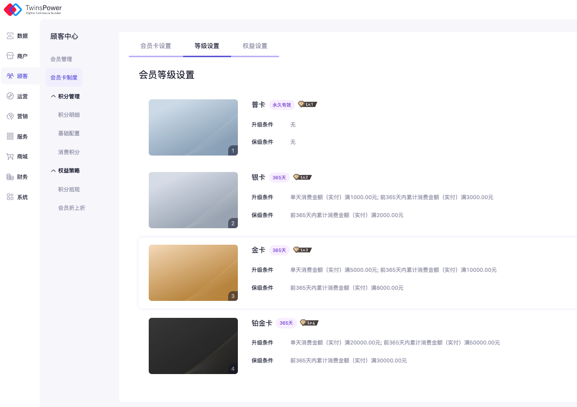 支持以实付金额、消费积分两种形式判断会员等级的升降;当商场内不同业态下消费金额差距过大时,往往各业态获取积分的比例也不同,则可以通过以消费积分升级的形式,适配不同业态的等级成长需求。