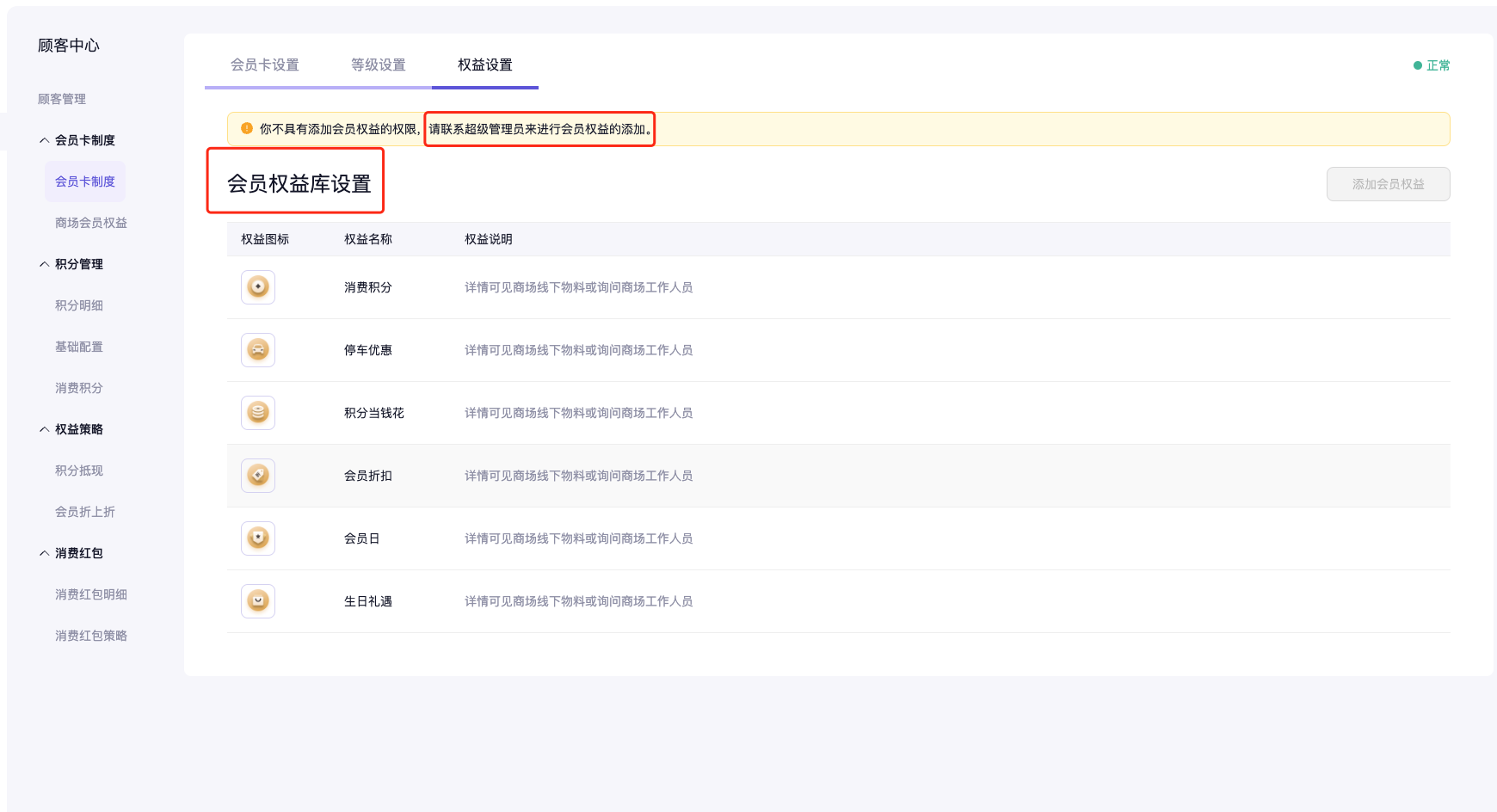 超级管理员可以在这里创建会员权益库设置,特别是对于集团型项目,可由集团超管设置会员权益库,各个项目再根据自己所在项目的实际情况从权益库中做选择及配置。