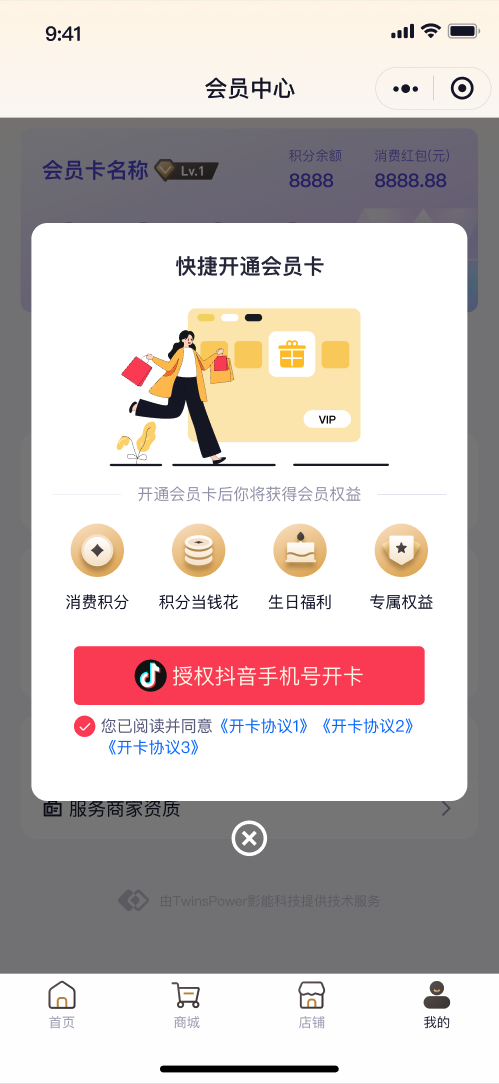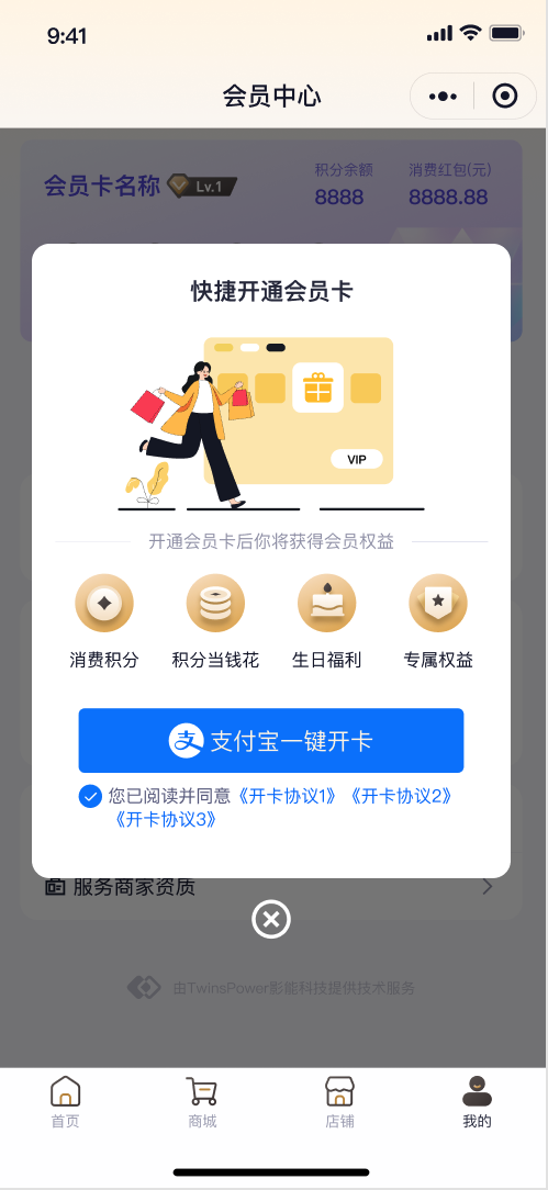 - 用户也可以在会员小程序 → 「我的」 → 「关于我们」页面中查看开卡协议。