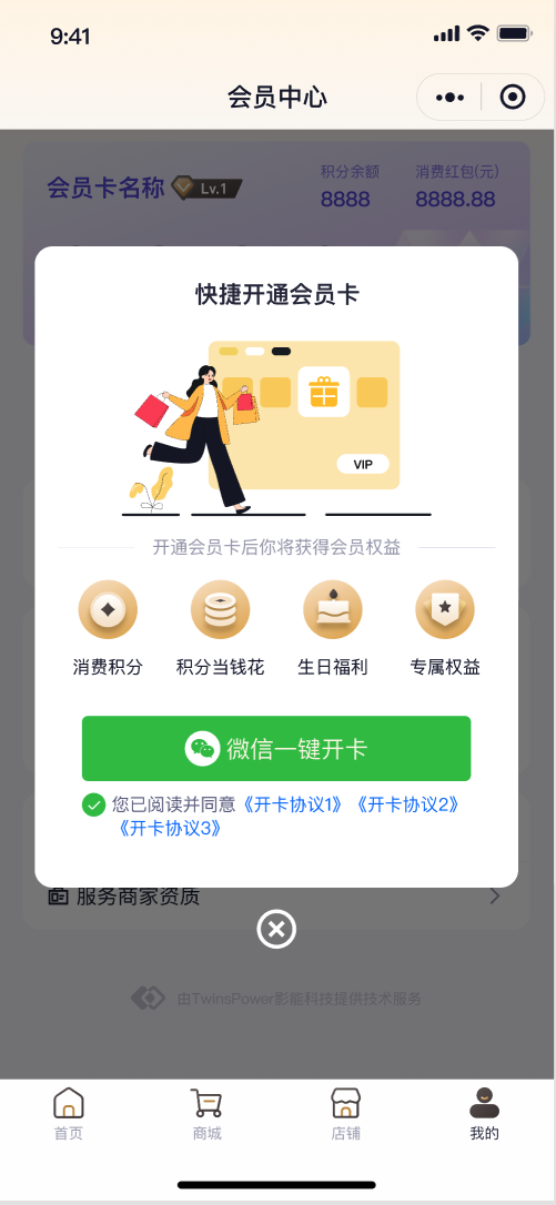 - 开启后用户在开通会员卡时须勾选同意开卡协议。