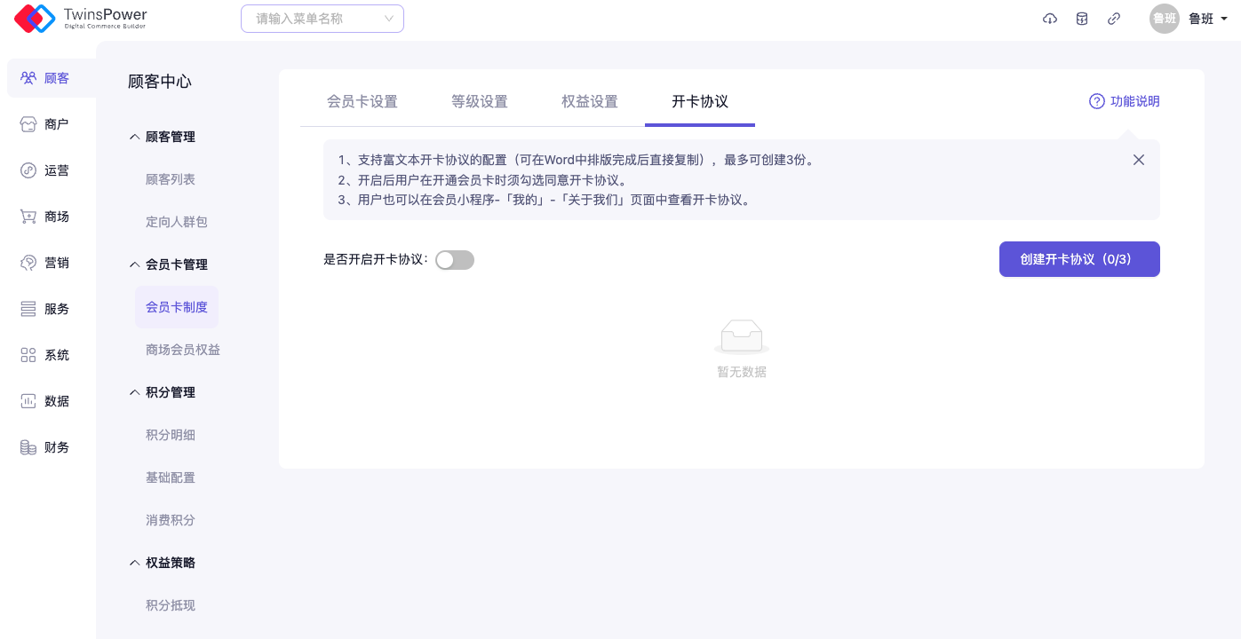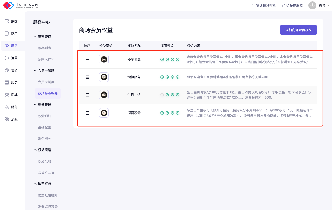 通常在系统初始化中,我们会按照商场的会员等级制度,在此处配置相对应的会员等级及权益,从而按照此处的等级制度进行自动升降级。该模板仅商管后台超级管理员可设置.